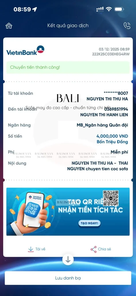 Cảm ơn chị khách đã tin tưởng và chuyển khoản đặt cọc bộ sofa may đo theo yêu cầu